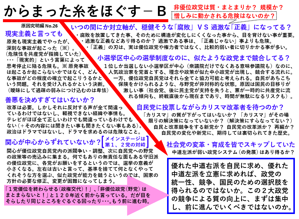 多党化は個々の政党を明確化させると共に、それぞれを小さくする事で、ある意味楽な立場にして、質を低下させると考えられます。しかしこれまでのストレスから、そういう政党にドラマや正義を求める国民が増えているのかも知れません。しかし誰かを、何かを「正義」だと認めてしまえば、歯止めが効かなくなります。と述べている念頭には兵庫県知事に関する問題もあるのですが、斎藤氏も自民党が支持する候補者であった事を忘れてはいけないと思います。もう自民党から自立すべき時だと思います。あとは、恨みで行動力を持つようになって人気が出るタイプ政治家がいるのなら本当に怖いというのも、最近考える事です。なお、社会党の変革については次のNo.27でまとめます。