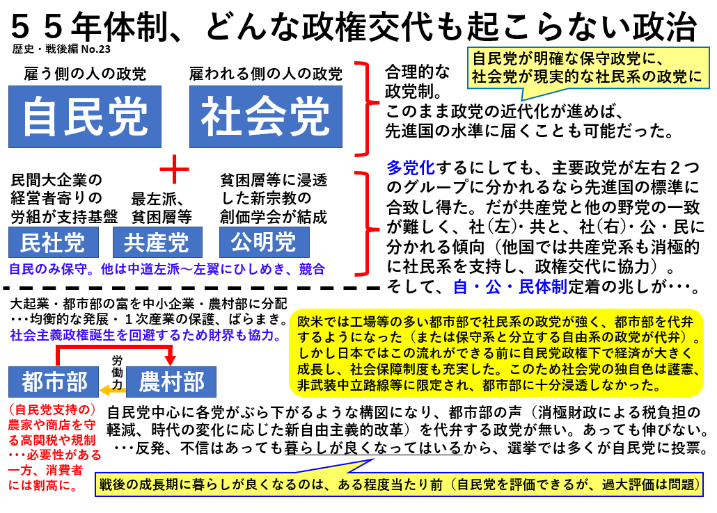 55年体制下の野党にはそれぞれ問題がありました。しかしそれは民主化されて日の浅い国における「挑戦者」としては当然で、問題はどう乗り越えるかという事。後からだから言えることかも知れませんが、色々あったとは言え、ブロックの形成、そこから外れる、外す政党があったとしても、互いにコミュニケーションを図る。そのための努力、根気が足りなかったと、どうしても感じてしまいます。たとえ緩いものであっても、ブロックの形成と維持は、政党を成長させると考えます(例外もありますが)。