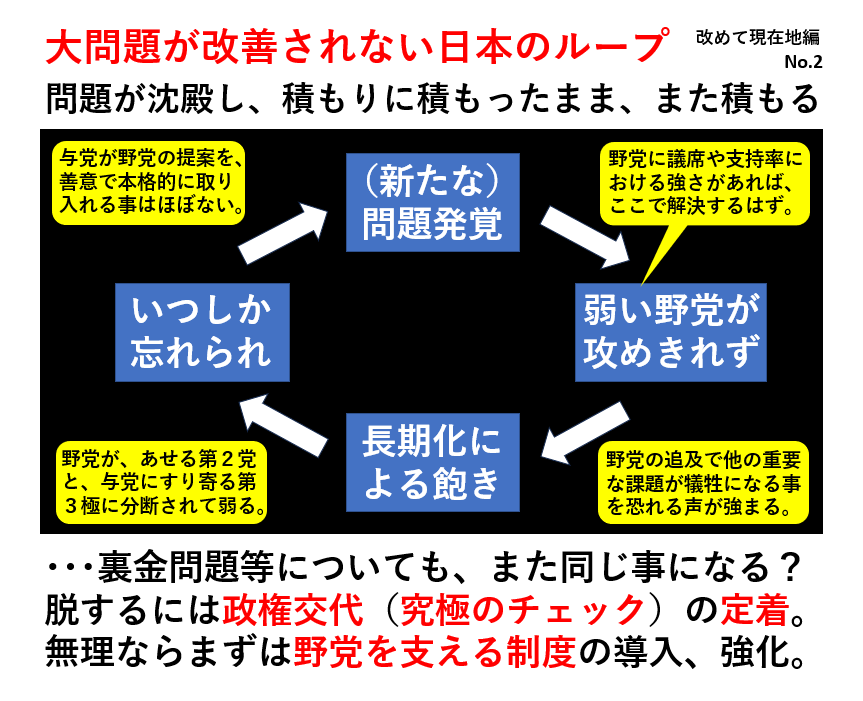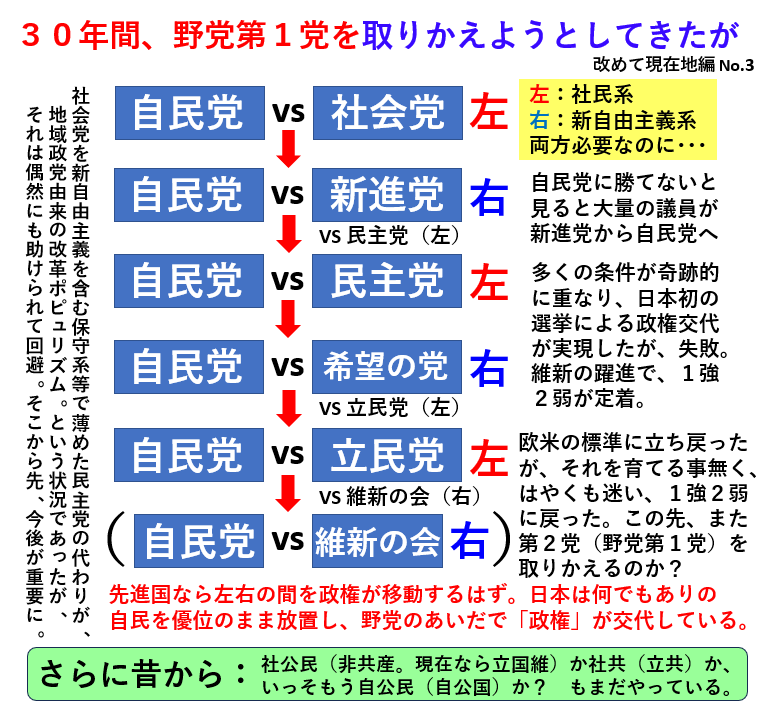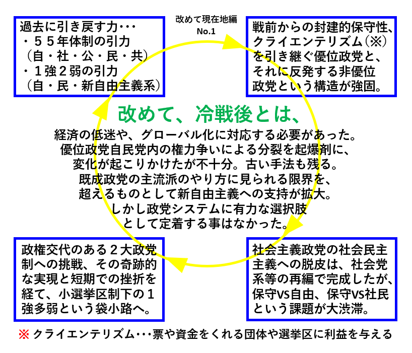 ここで一度、やり残した事も補いつつ現状を整理し、その原因、解決策へと進みたいと思います。55年体制のような多党化(ミニ政党含め)も、冷戦後の1強2弱も、現状では成り立たないし、続きようもない。それなのに引力だけは強いというのが厄介です。