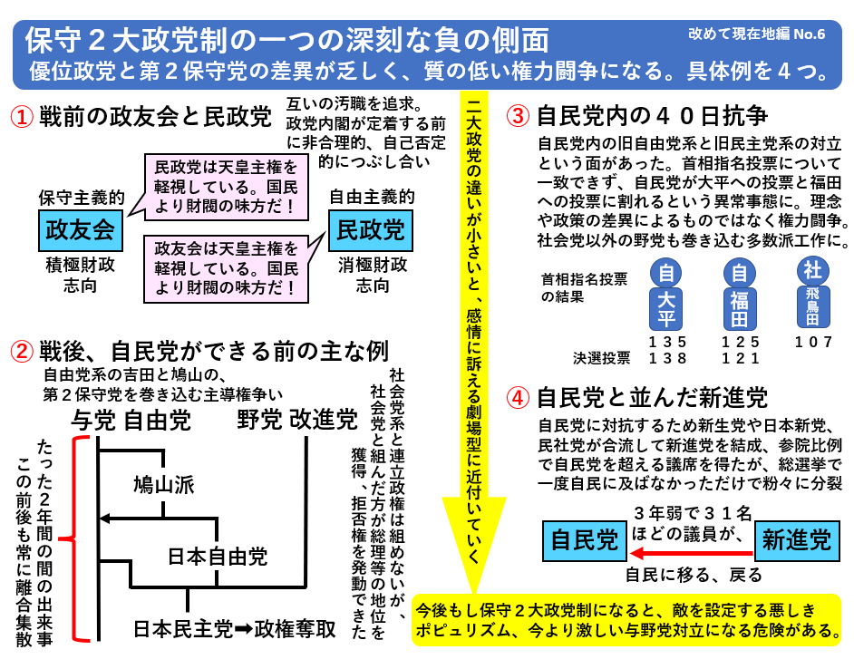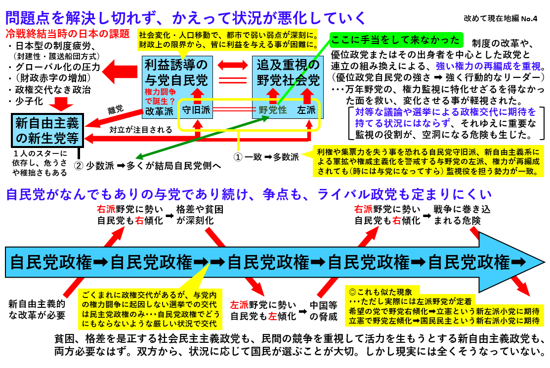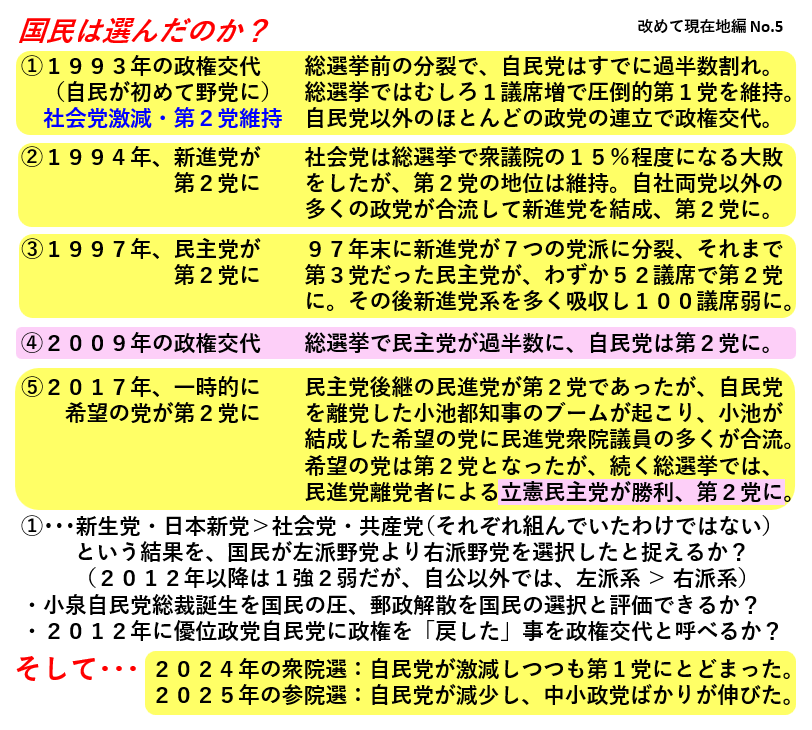政党・有権者全体が近い時期に左右にある程度移動するのは普通の事ですが、日本の場合、それがなかなか争点にならない(争点がつぶされる)のが問題だと思います。これでは真の成長は困難。まずは本当の意味で選べるように、政権交代を定着させるしかないと考えます。