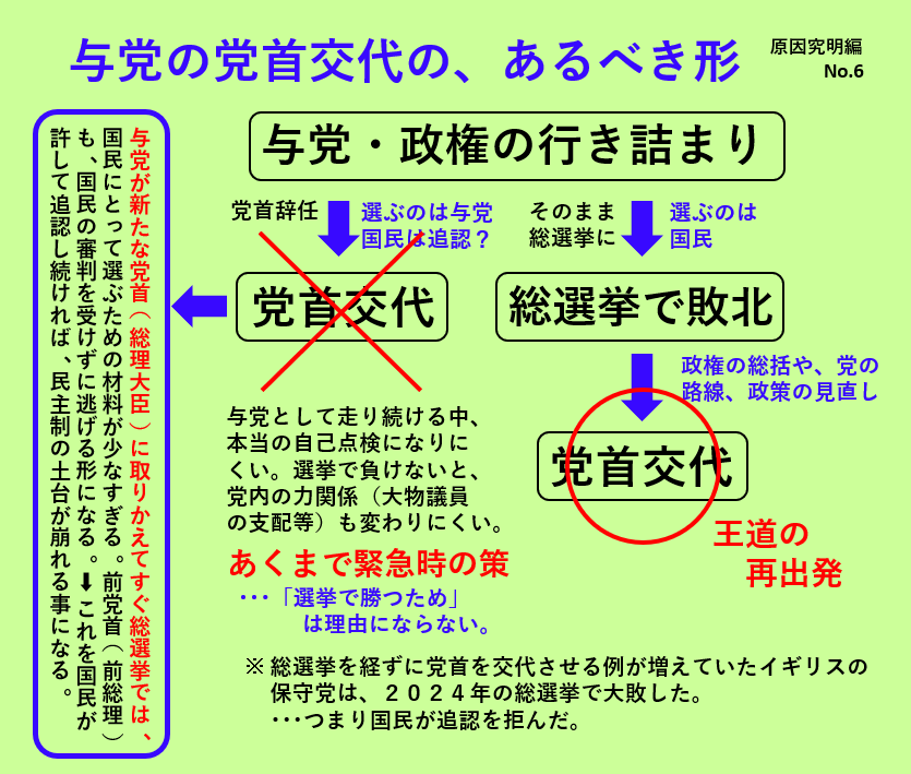 今回の自民党総裁選の前後で、当選した石破氏がことごとく正反対の主張をしている事からも、与党が総選挙を経ずに、選挙対策として、党首・首相を交代させる事の愚かさが分かります。自民党に都合が良いという事は、自民党がまともに試されずに質を下げる事を意味し、本当は自民党にとっても良くない事なのですが…。