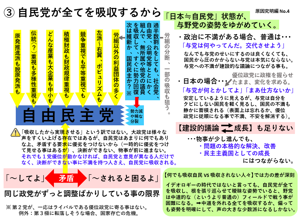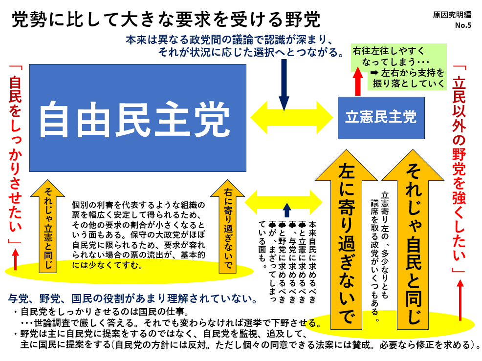 野党は追及ばかりと言われてきた印象ですが、追及が足りないとも、実際には言われてきました。この事が示すように、自民党が何でも調整する万年与党であり、自民党での調整が政策的な関心の中心であり続け、その外に、政策を戦わせるものの、勝者が半ば固定されている選挙や議会があるという2重構造では、建設的な議論は広がらないと考えます。