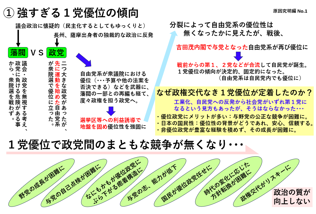 時間がかかりましたが、日本の政治に問題がある、その原因を整理していきたいと思います。その上で、それを踏まえた解決策を考えたいと思います。1党優位を改めるのは国民の投票ですが、そこへ持っていくためにできる事もあると考えます(秘策のようなものではなくても)。