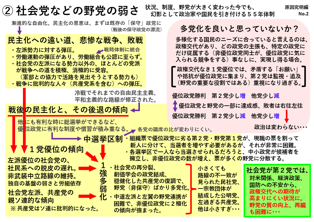 社会党のせいにするのは簡単ですが、社会党の問題は原因であると同時に、結果でもあると考えざるを得ません。そしてもう一つの結果が、第2党を取りかえられない状態でした。では今の立憲、他の野党はどうなのかという事については、対立軸の問題とまとめて図にする予定です。
