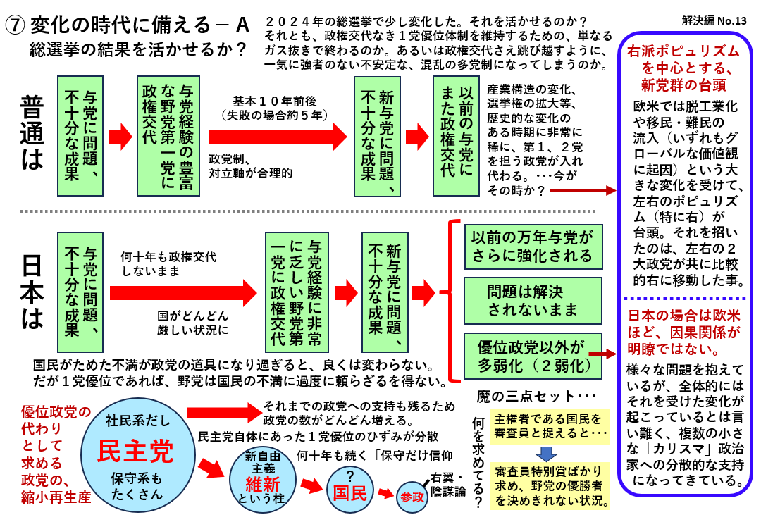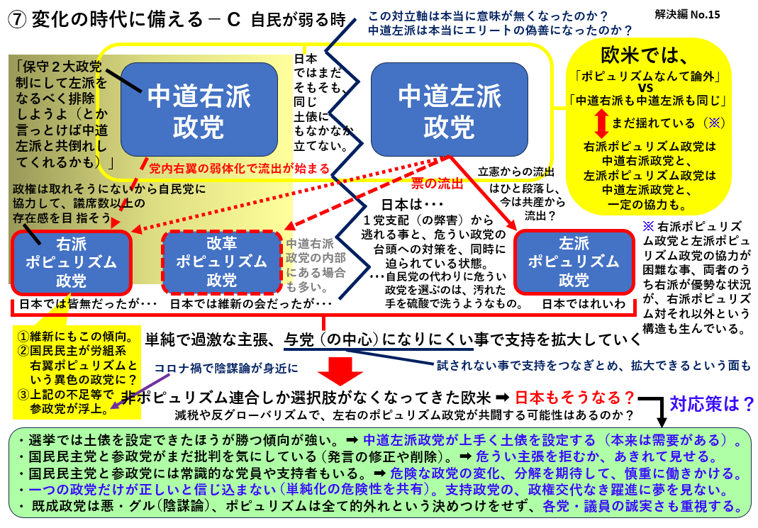 今は自民党が弱っても展望が開けないように感じられます。でもこの格差が拡大しやすい時代、変化の時代こそ、「普通」の人を含め、立場が弱い人を守る(支え合う)中道左派が求められている面はあると思います。今の危うい状況が、逆にそれを認識させるという事もあり得ると思います。