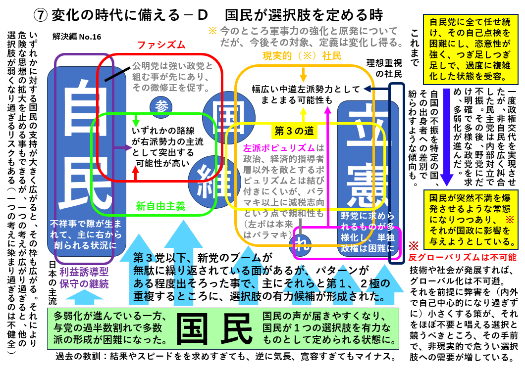 ポピュリズム台頭への対策を考える前提として、少し整理したいと思います。政党の円の大きさには実際の勢力だけでなく、拒否感の小ささも含まれています。一時的に風が吹いても知られる事で拒まれる。そういう遠回り、ミスのない地味な選択、変化の先にしか明るい未来はないと感じます。