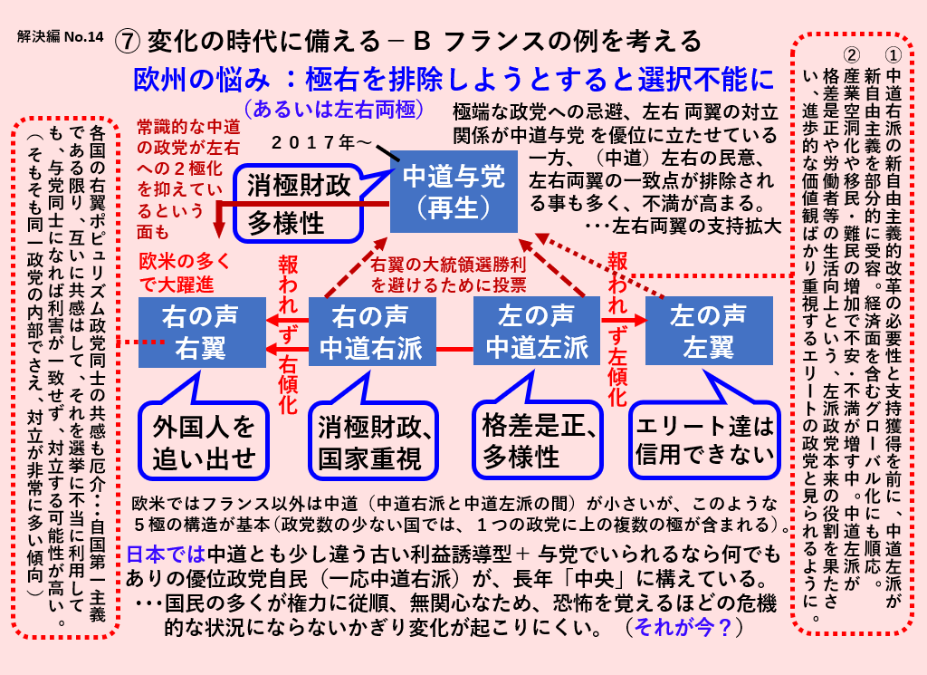 ドイツが大連立の常態化という問題にぶつかっている一方、大統領制ゆえ、従来の2大政党の間に別の第1党が誕生しているフランスは、その政党を率いる大統領が、消極的にも選択され続けている。しかし議会では少数派に。これは日本で言えば自立大連立か、自民党が弱ってもなお中心にあり続けるか。という事になります。大連立は現状ではまだ立憲にとって不利であり、やりたくないはずです。極端な政党を強めたり、多党化を進めて多数派形成が極端に困難な状態をつくったりしなければ、あるいは立憲を完璧に第3党以下に落として、その境遇を変えなければ、自立連立はできないはずです。