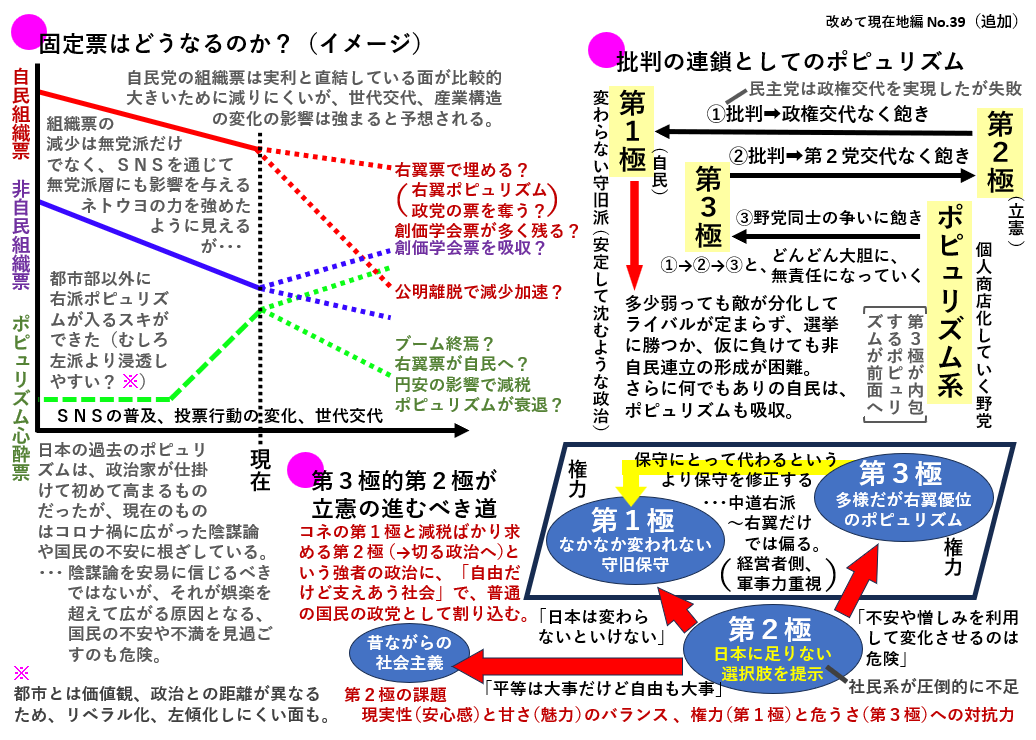 SNSの普及や世代交代の結果が、権力と軽さ・危うさによる制圧という事になれば、それはあまりに残念だと思います。権力(第1極)と昔の自分(≒第3極)に同時に対抗するのは大変ですが、立憲にはそれらに負けない力強さとスピードが求められていると思います。