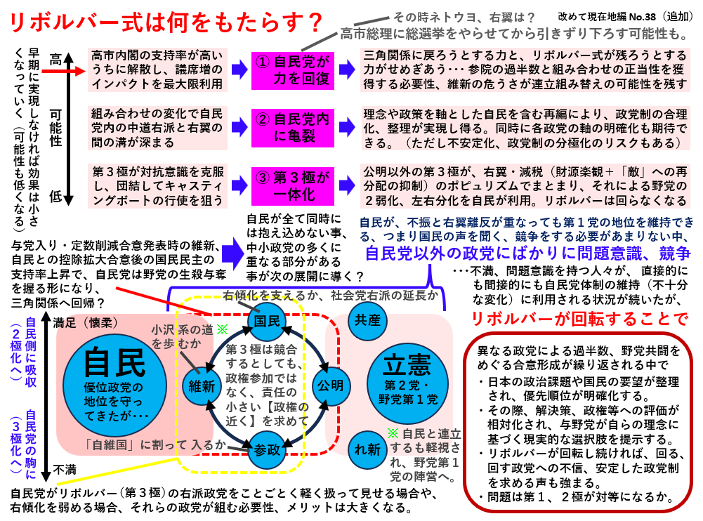 国民民主が補正予算に賛成し、維新が定数是正等について強硬な姿勢をとれば、またリボルバーが回される可能性があります。このリボルバー式の先にある可能性については、次の図でもう少し整理したいと思います。